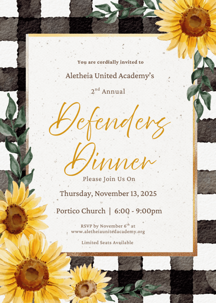 Please join us for Aletheia United Academy's Second Annual Defenders Dinner. This event is a great way for those in the community to come alongside our mission and vision. It is with great pleasure that we can offer this event free of charge to our guests. Because of the support of local business sponsorships, you can enjoy the evening without an entrance fee!